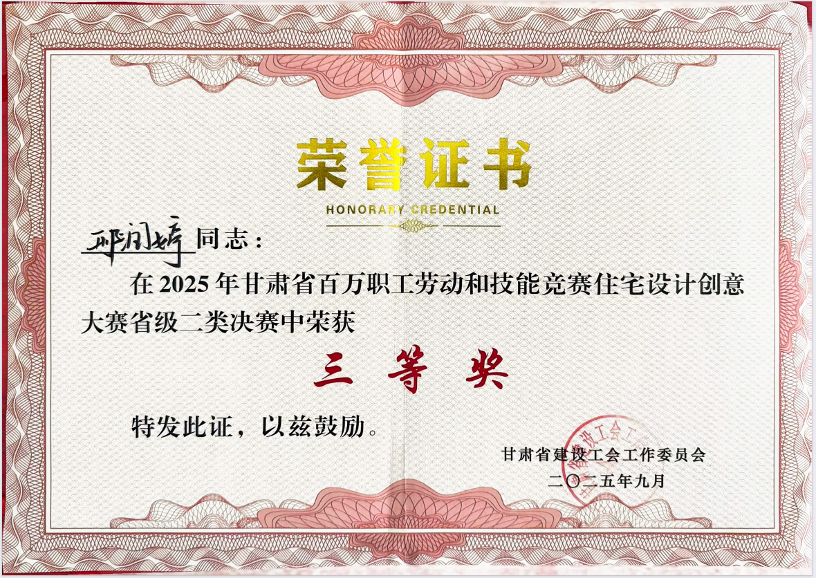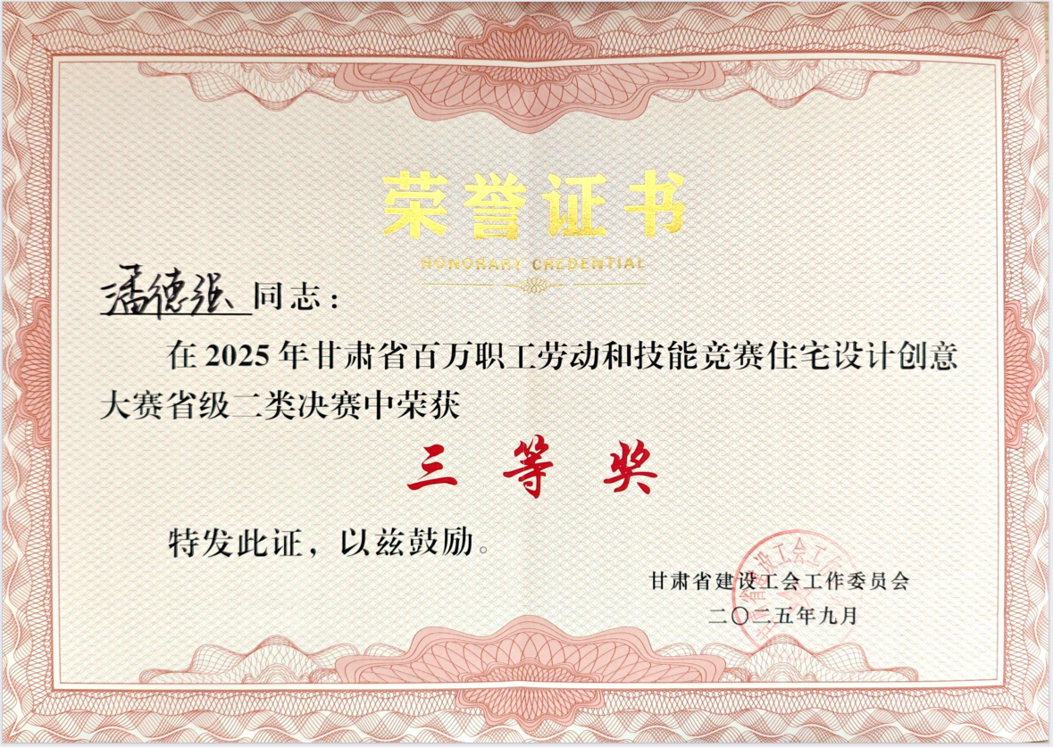 近日,由甘肃省建设工会工作委员会主办,甘肃省勘察设计协会承办,甘肃工程咨询集团工会、甘肃省城乡规划设计研究院有限公司协办的2025年甘肃省百万职工劳动和技能竞赛住宅设计创意大赛省级二类决赛在兰州落下帷幕。最终省建筑设计院选派的四名参赛选手斩获佳绩,其中,设计一院姚八依获得二等奖,设计一院邢润婷、潘德强、设计二院蔡磊分别获得三等奖,省建筑设计院获得优秀组织奖。